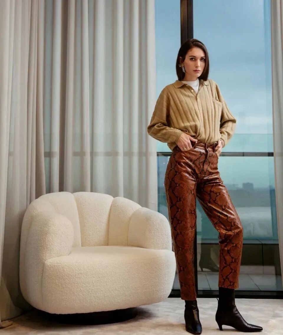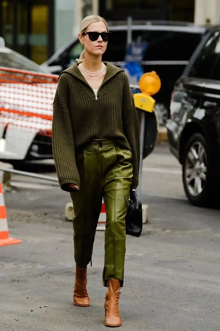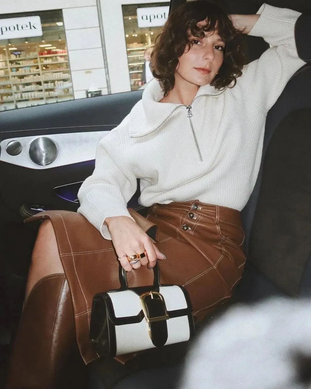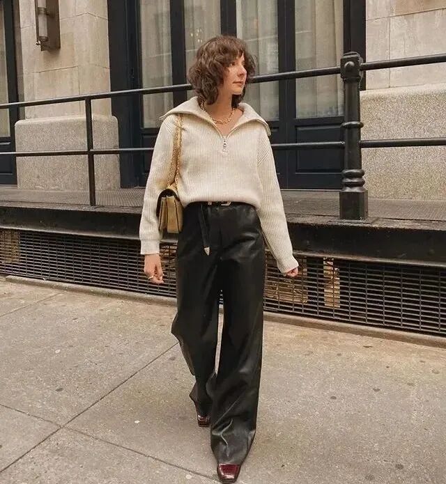 米色polo领毛衣温柔不失气质,搭配版型硬挺的皮裙和剪裁合适的阔腿皮裤,立马变身时尚小魔女!
