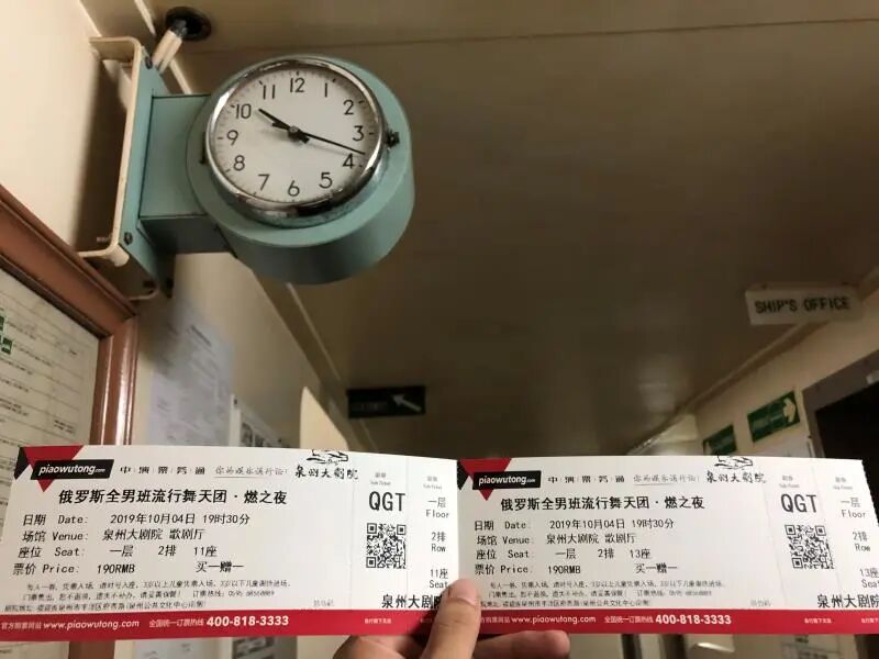 2019年10月4日2218时,我在船舱,拍下了这两张未使用的1930时的演出票根——现在仍在我的收藏盒子里,有遗憾,才会珍惜那些入座的机会。在海面上,票都无法送出去——在剧院群里看照片云观演,也不失为一种就座,原谅我的缺席,心与演出同在。