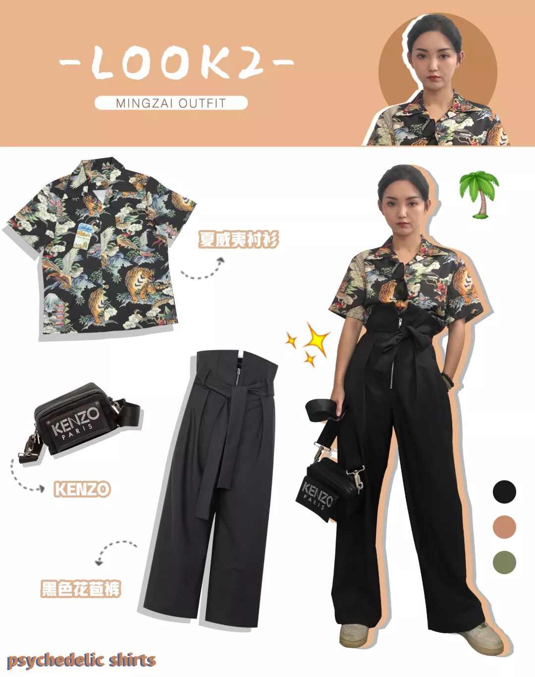 鞋子我穿了街头风的白色运动球鞋,和“大佬”感觉的黑色花衬衫相呼应;包包是之前买的KENZO的方形斜挎包,有棱有角很硬挺,搭配这身娘man感的衣服,刚刚好!