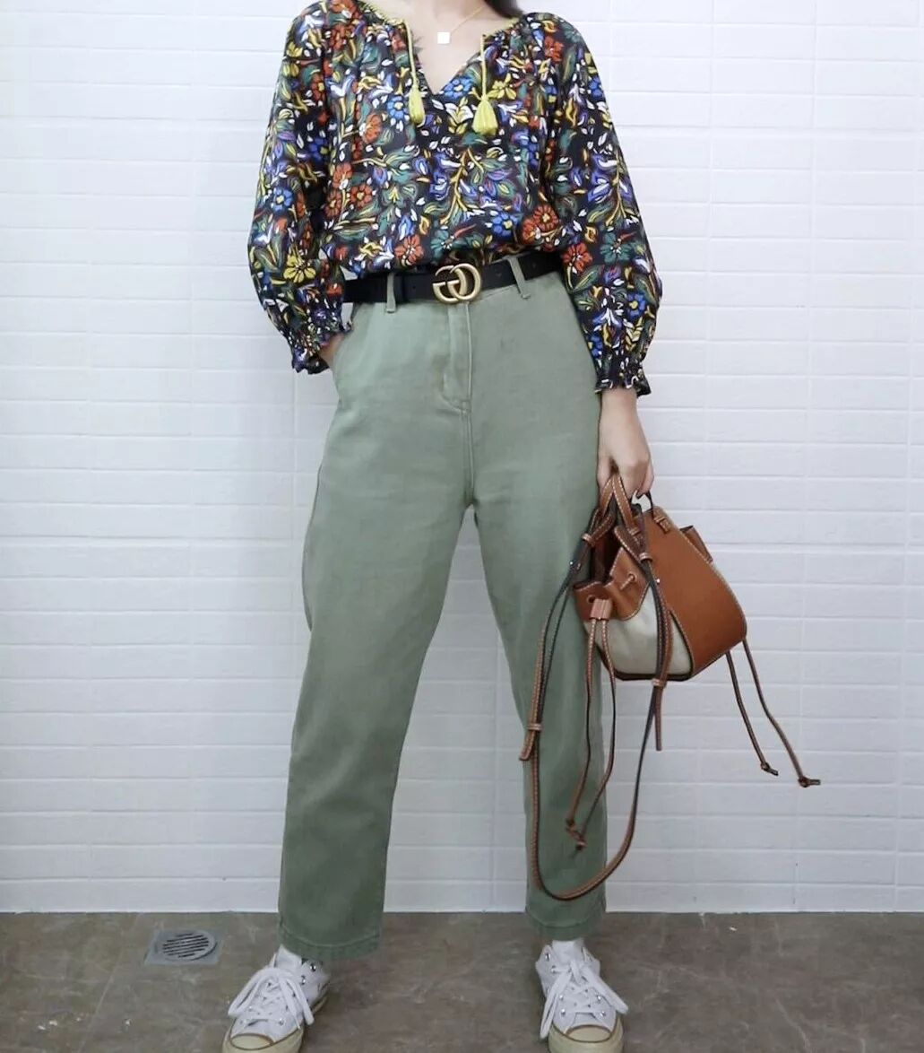 很多花衬衫的下摆都会比较长,所以把它塞进裤子里,是最简单又显腰线的穿法。