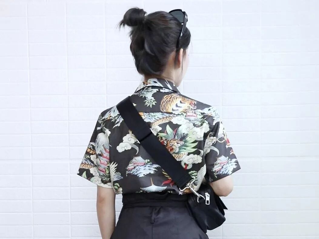 这件小孩趣味图案的短袖衬衫其实是SODA的男装,但是穿在我这种娇小的女生身上也完全OK,涤纶材质带有廓形效果,很能遮肉,而且还有微微的光泽感。