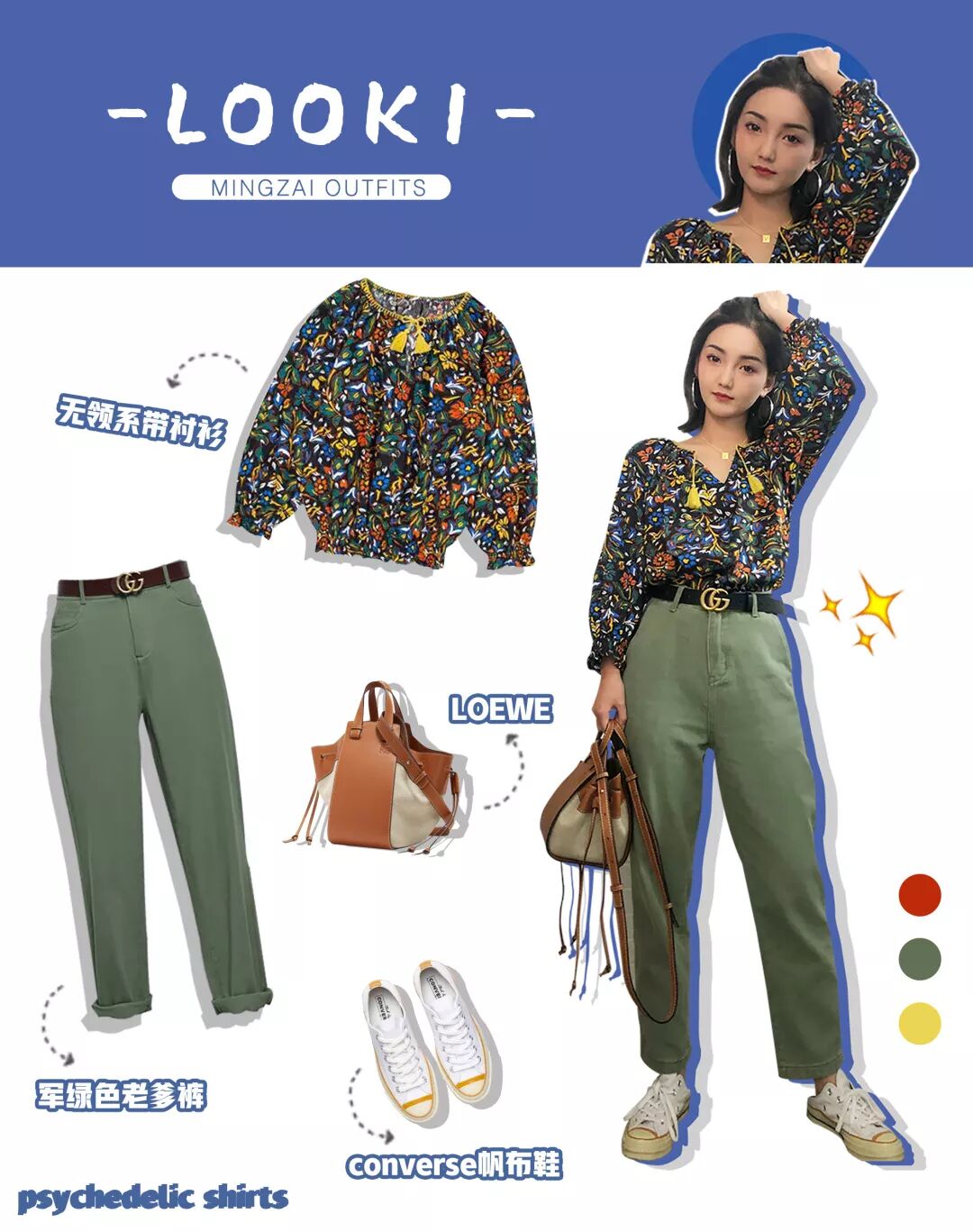 因为上身已经有一件很夺目的花色衬衫了,所以鞋子和包包就尽可能简单点吧,像白色的vans帆布鞋和loewe的小包也就足够了。