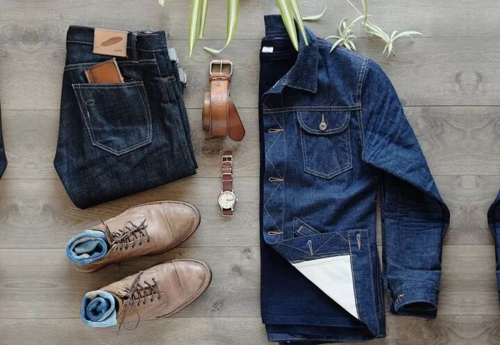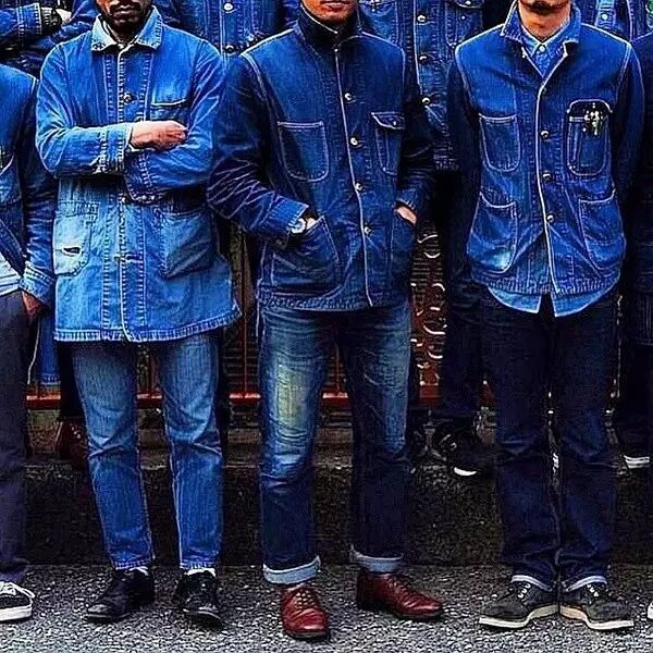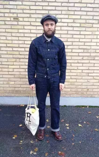 天气冷的时候,套个工装夹克就可以,整体配色是深蓝、不同深浅的黄和不同深浅的棕: