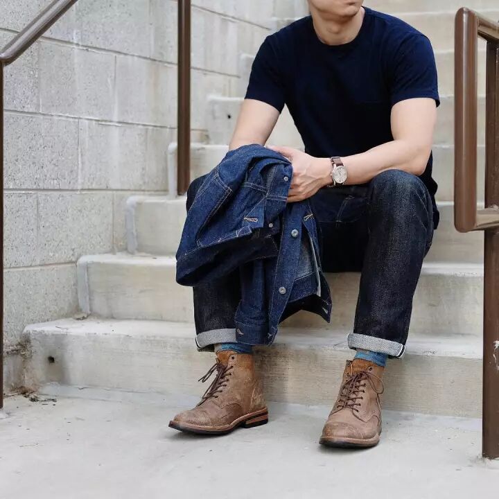市面上比较常见的工装靴为深棕、酒红和黄,搭配深蓝、军绿、土黄、暗红都是不错的选择。