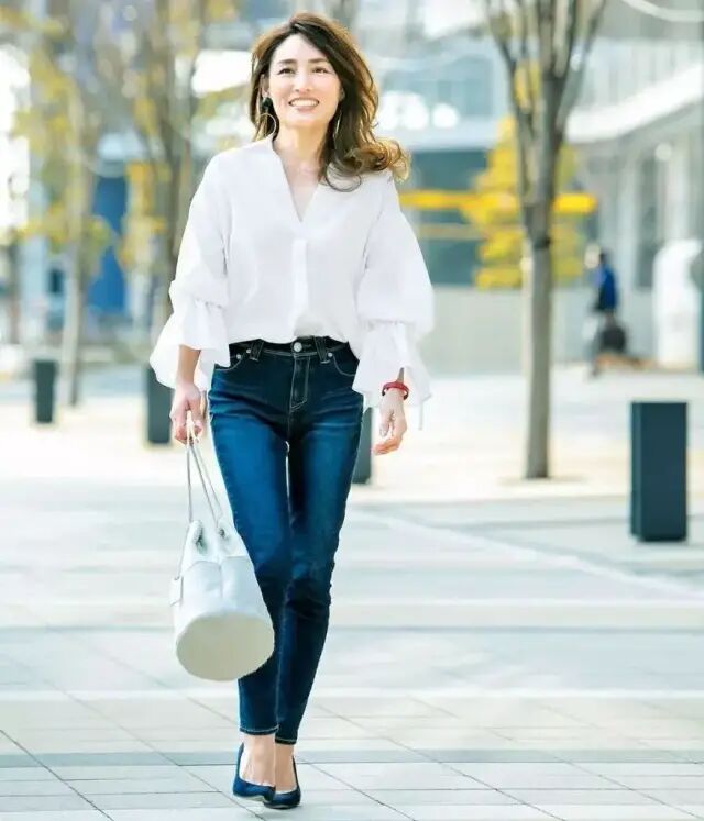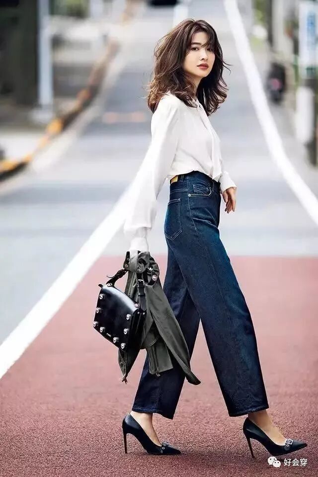 宽松的白色衬衫和九分裤搭配,因为中长款的版型,腰粗、臀圆是可以很好扬长避短的;