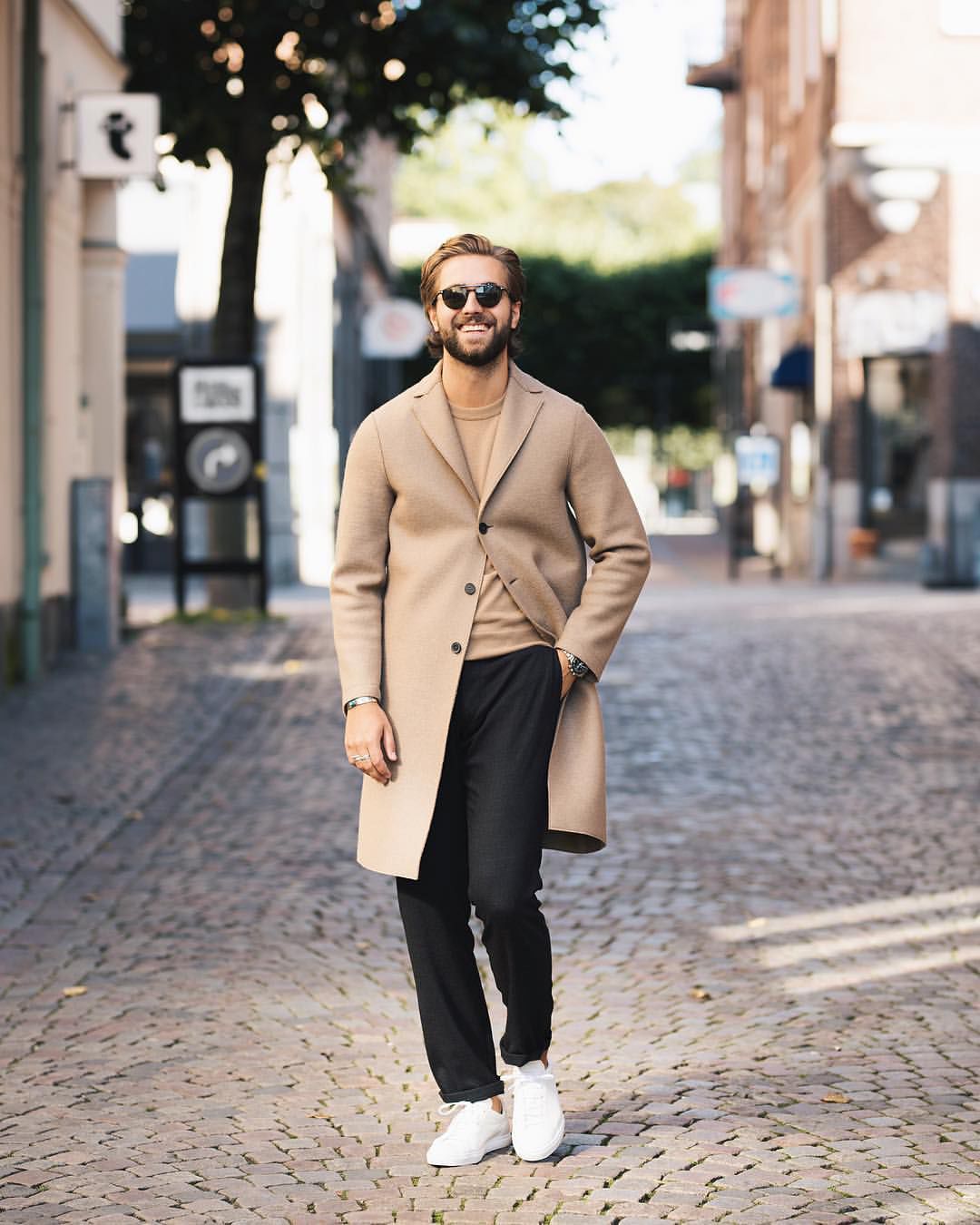 想要更商务一些,把驼色长风衣的腰带绑起来,内搭一件烟管领的黑色毛衣,有质感的男人大抵就是这样了。