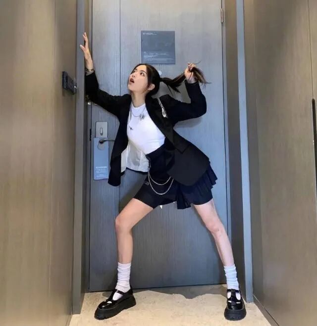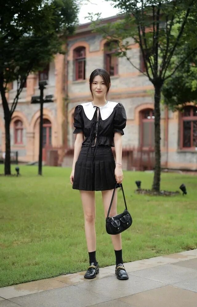 搭配的小皮鞋,有金属扣的设计,搭配上高腰的袜子,所呈现出来的色调一致,不会给人一种不协调感,同时所搭配的包包也是黑色的,用金色以及白色小面积的点缀和肤色之间的穿插来塑造了层次感,看上去不单调,既显高又温柔。