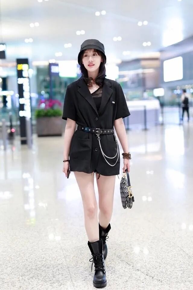 在搭配小皮鞋的时候,黑色是最好的,尤其是对于喜欢中性风格的成熟女性,适当露肤可以打破黑色的沉闷,吊带背心用金属饰品作为点缀,下半身则是搭配了高腰的不规则黑色半身裙,有一定的挺阔感,马丁靴加持更加帅气,皮质的腰带进行了三七比例的分割,实在是太完美了,既有个性又不失时尚。