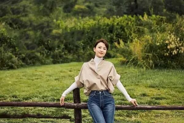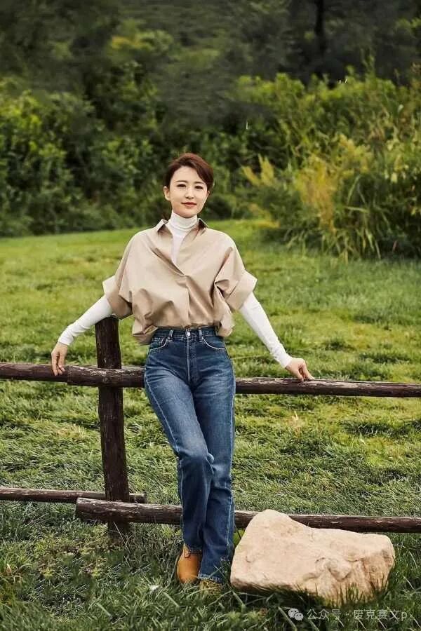高腰牛仔裤不仅能够拉长腿部线条,还能够在穿搭中带来足够的舒适感。这样的搭配不仅适合户外活动,也展现了张蕾对于穿搭的独到品味。整体造型时尚大方,既追求了舒适度,又呈现出知性优雅的氛围。