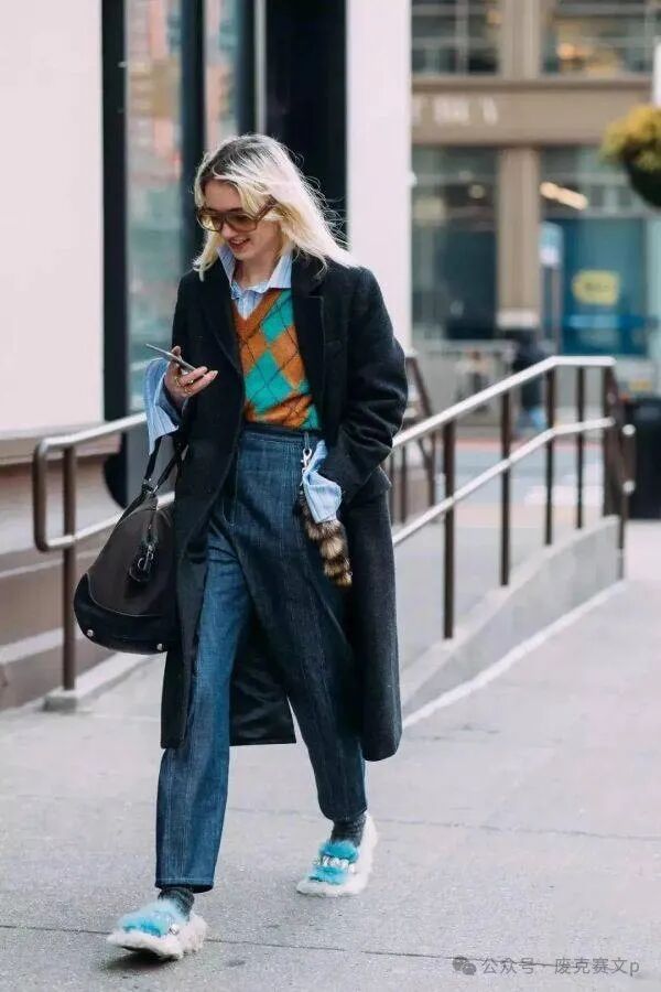 搭配拼色格纹元素的针织衫作为夹层,更是使整体造型更显时尚感。这样的叠穿方式既充分利用了不同单品的设计元素,又使搭配更具层次感和亮点。搭配一款基础的黑色大衣,则为整体造型锦上添花,既保暖又时尚。