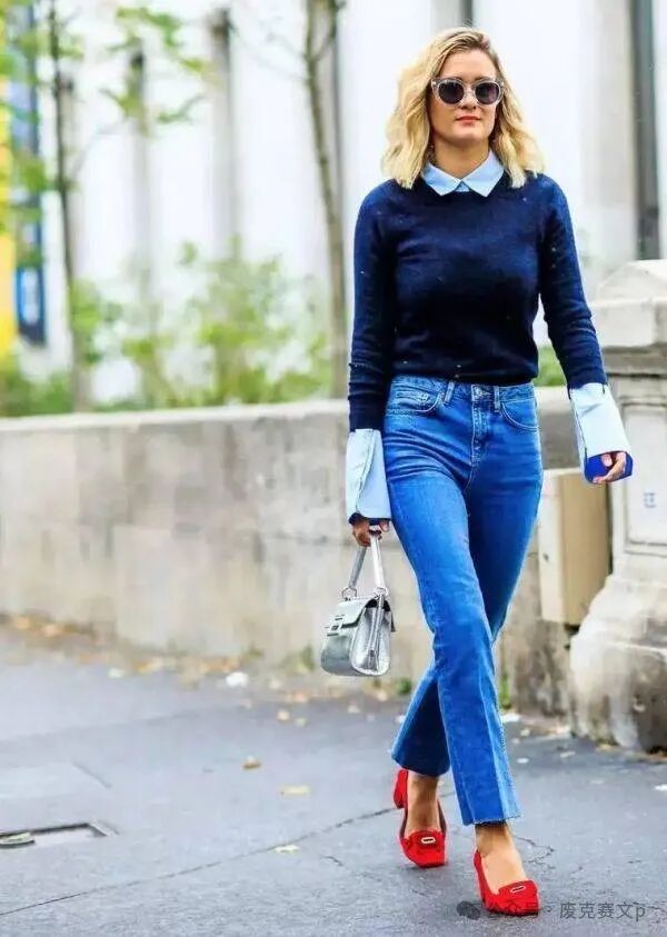 衬衫的叠穿方式的魅力确实体现在细节之间,例如模特身上的这款搭配。采用基础的淡蓝色衬衫作为内搭,搭配上修身的深蓝色针织衫,通过领口和袖口部分巧妙露出的衬衫细节呈现出时髦抢眼的效果。特别是衬衫袖口加长的设计几乎将大半个手背遮挡,为这个俐落的搭配增添了更多的温柔感。
