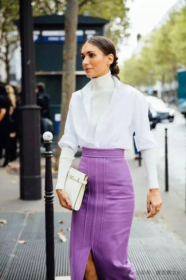 特别值得一提的是,下半身的亮色高腰开叉半身裙。这个巧妙的选择为整体造型注入了时尚元素,展现女性的优雅和独特品位。高腰设计不仅拉长了腿部线条,还显得更有层次感。开叉设计则既增添了穿搭的性感韵味,又保持了整体的舒适感。