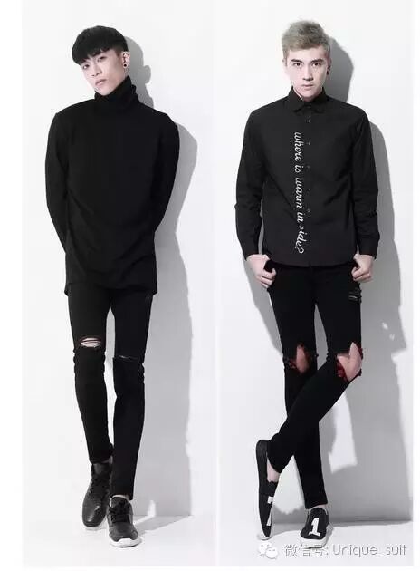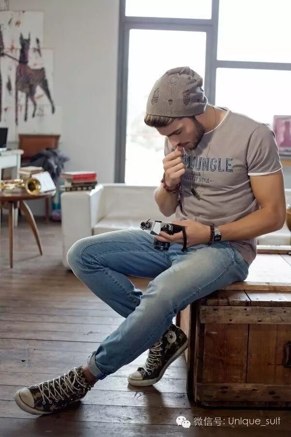 腿型较粗的男士腿粗的男生在选择牛仔裤的时候最好选择合身的,不要太紧,也不要太松、那种弹力铅笔裤和嘻哈掉档裤都没有写你们的名字,想穿就减肥吧。而且最好选择深色系的直筒牛仔裤,不要有太夸张的做旧效果,略微有水洗效果就行了,不要让大家把视线放在你的腿上。