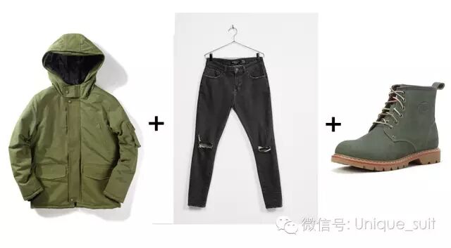 身材适中的男性很好选择衣服,普通的搭配就可以让你展现好身材。可以选择今年比较流行的军绿色棉衣搭配黑灰系列的牛仔裤以及工装鞋。硬汉形象塑造起来~