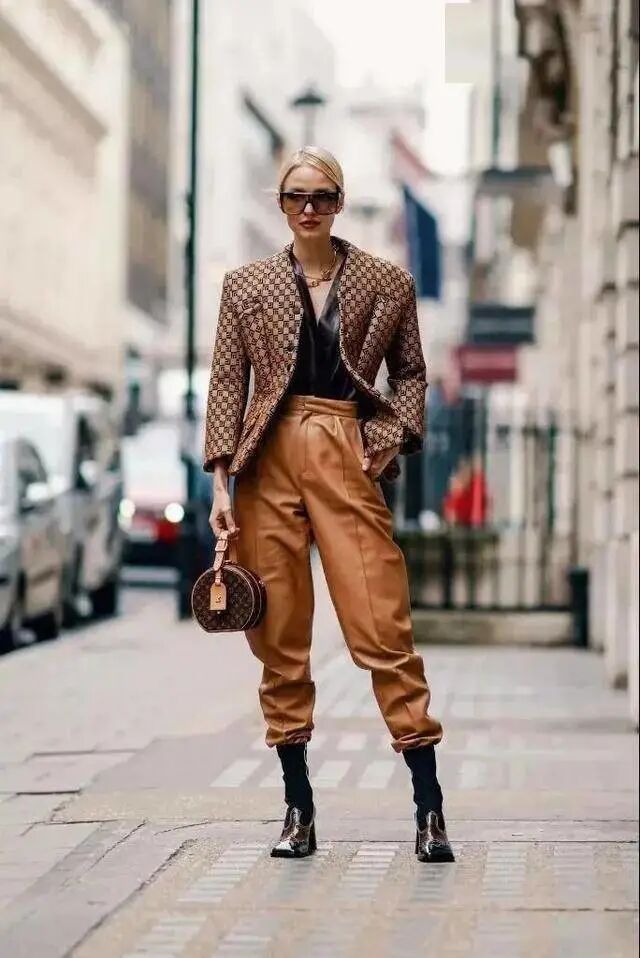 皮质是当下大热材质,皮质的香蕉裤,显腰线显身材,亦能增加穿搭的舒适性,兼具时髦与实用性。