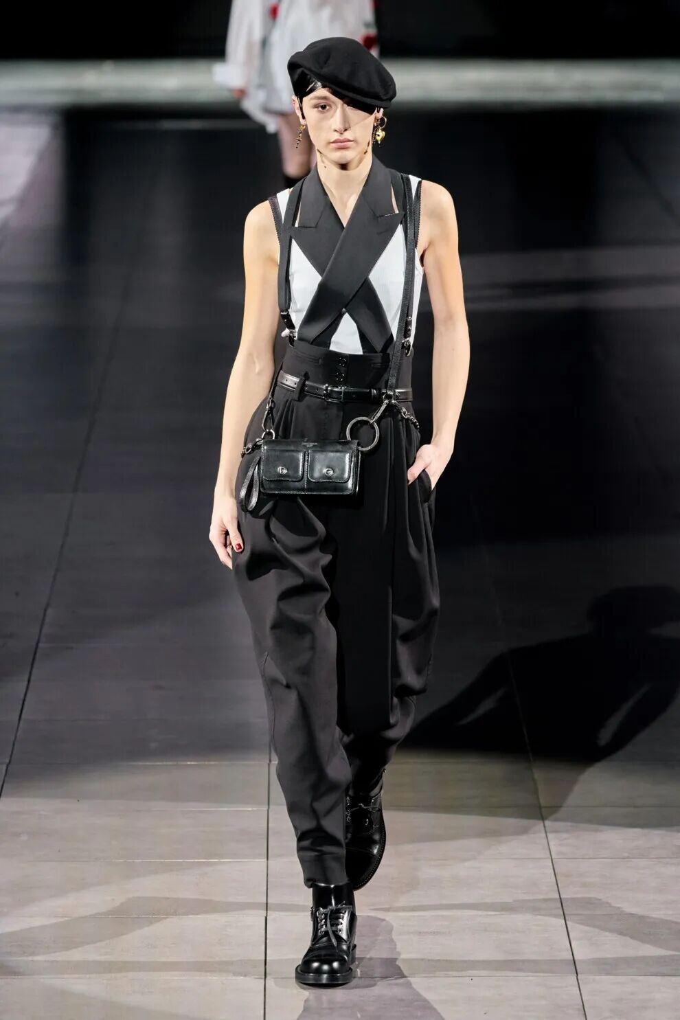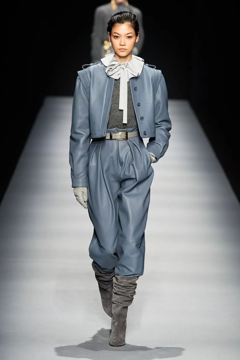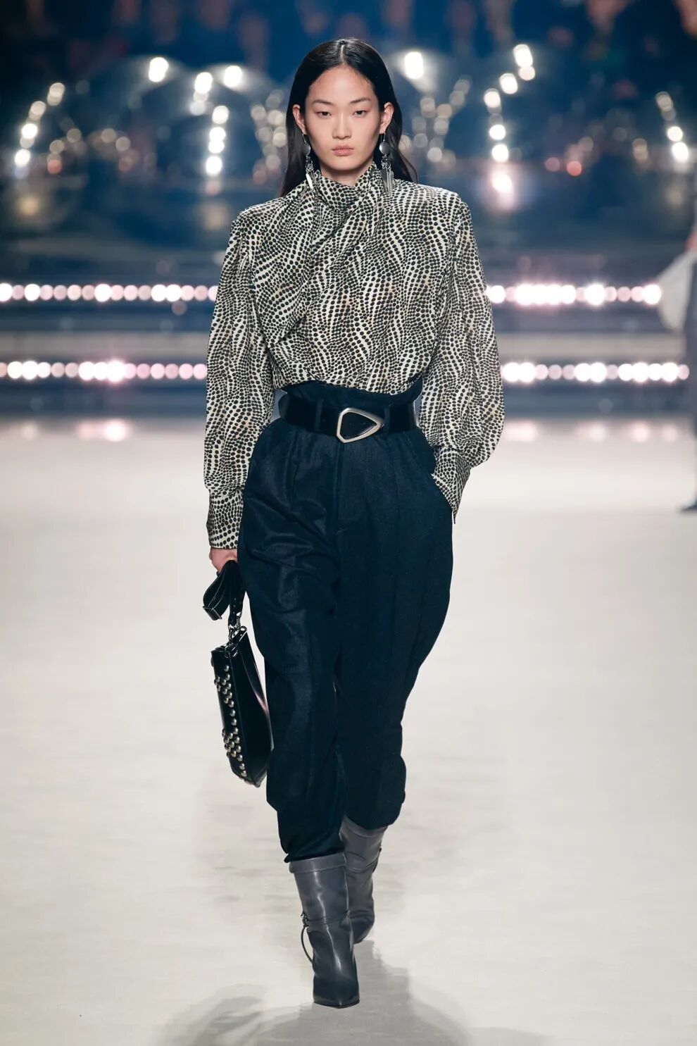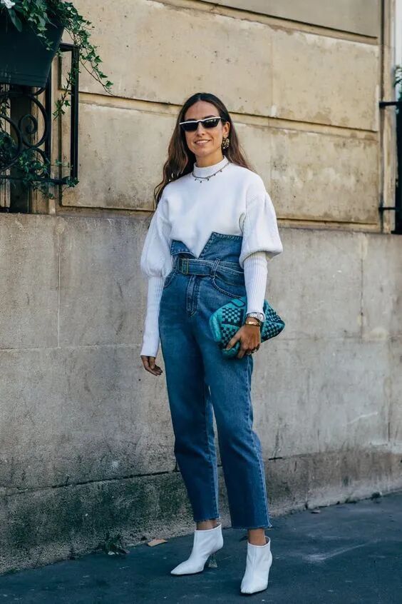 任何一种裤型,因为做工、细节、甚至配饰的不同,都有可能适合不同的风格,比如说下面这一类偏宽松的香蕉裤,搭配这种褶皱靴,更适合戏剧、自然、时尚型人。