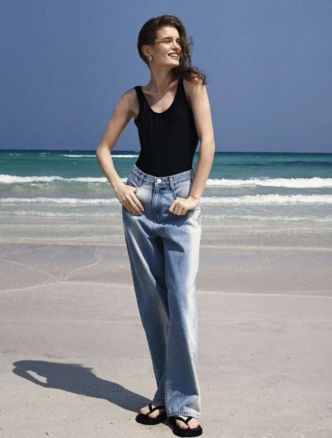牛仔阔腿裤搭配黑色背心,看似随性自在又尽显休闲高级感,搭配一双人字拖慵懒的感觉放大,穿出永恒经典