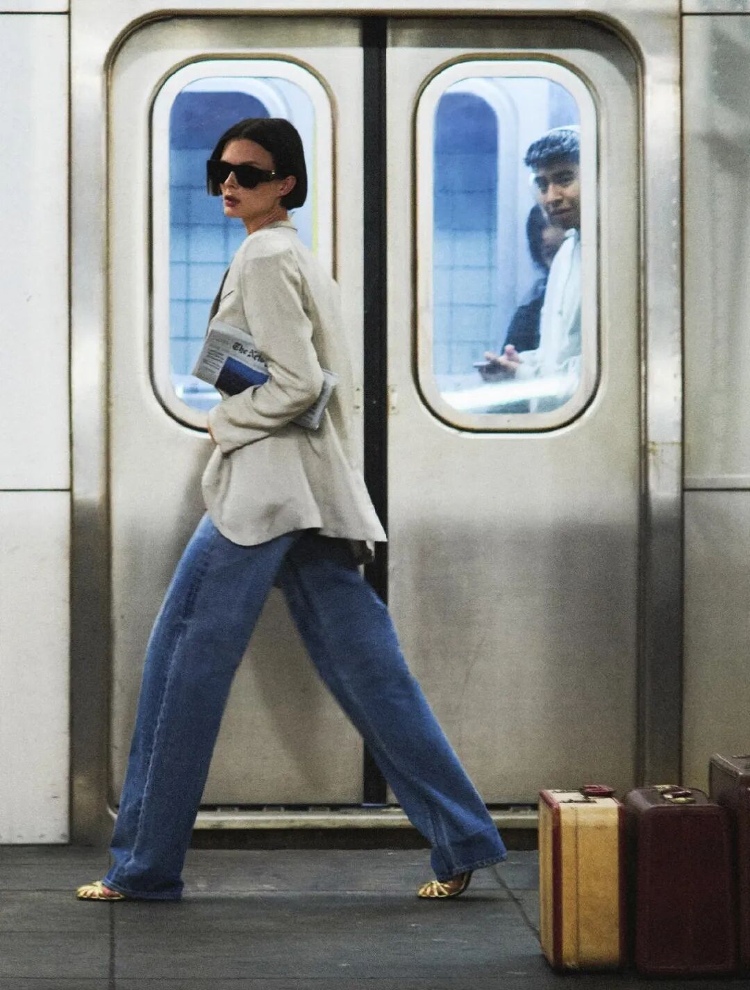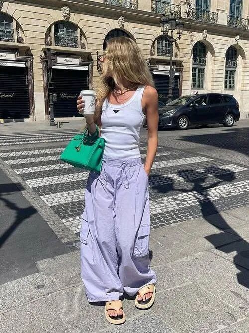 白色阔腿裤搭配一件无袖马甲背心,展现出不被限定的自由样子搭配一双细跟凉鞋露出腰线,瞬间穿出了松弛感,舒适且高级