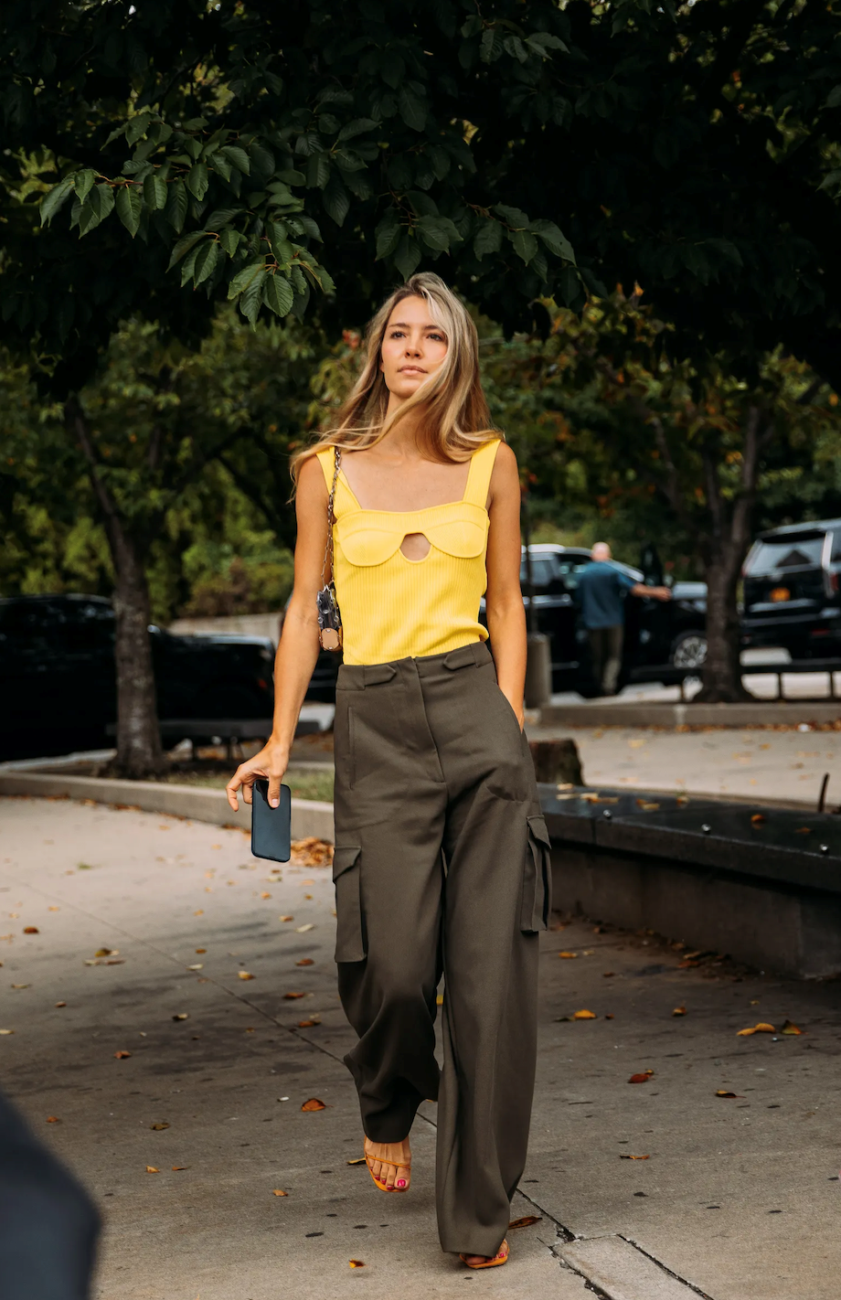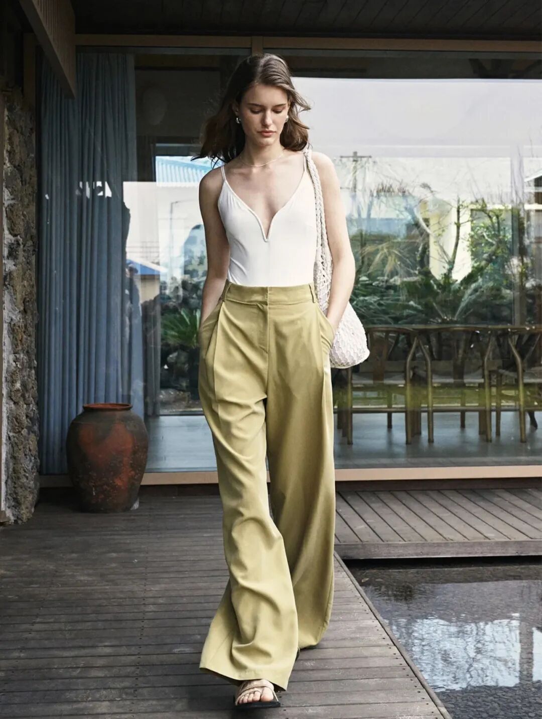 白色v领吊带搭配姜黄色阔腿裤,这样的穿搭可以让你在人群中脱颖而出搭配一双一字凉鞋在慵懒中多了点休闲氛围