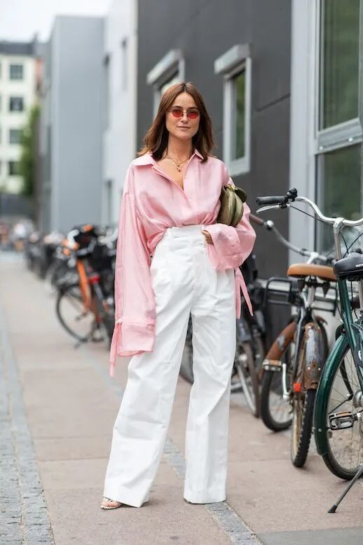 粉色衬衫搭配白色阔腿裤,温柔中带着迷人的气息,搭配一双高跟凉鞋把下角塞进去诠释出大女人的独立自由气质