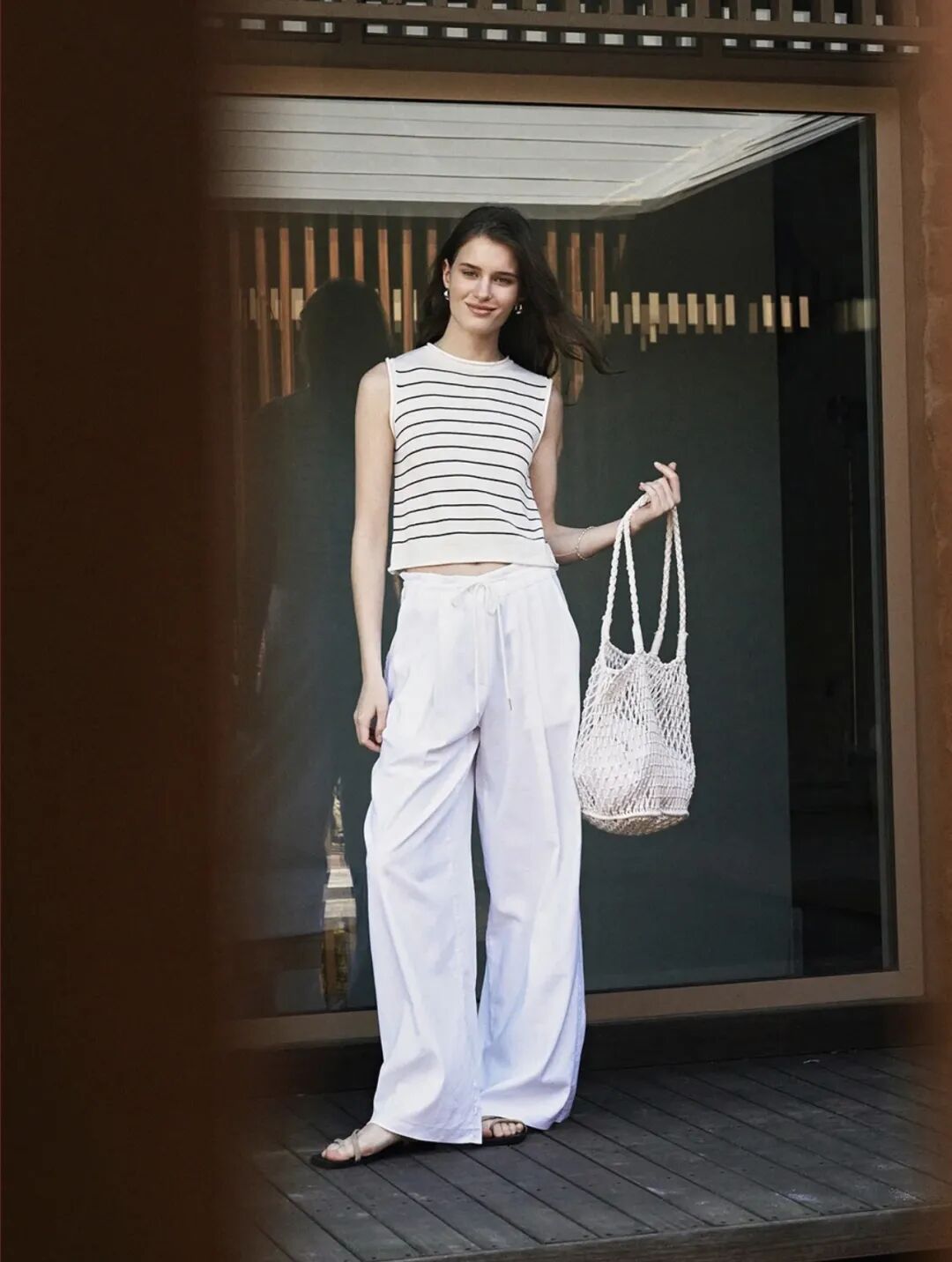 阔腿裤搭配白色衬衫内搭一件白色背心,可以营造出优雅大女人气质,搭配一双人字拖就很随性休闲又高级