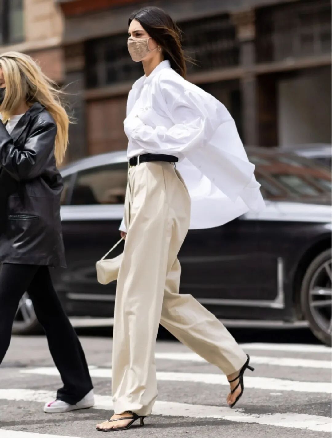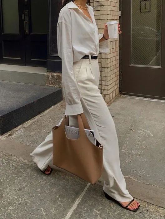 白色衬衫搭配白色西装阔腿裤,这样的穿搭是经典永不过时的搭配,穿上一双一字凉鞋可以让穿搭瞬间高级慵懒起来。