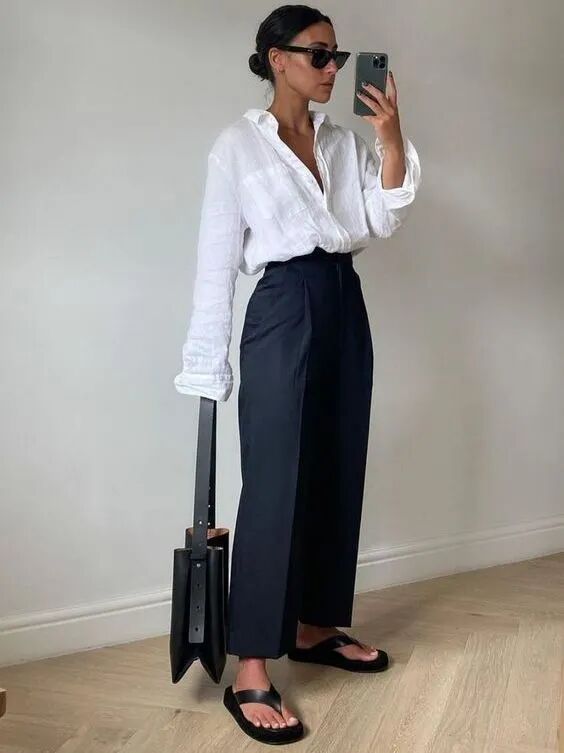 黑色亚麻阔腿裤搭配白色亚麻衬衫,下角塞进去腰里看似平淡,实际细节满满,搭配一双人字拖高级又充满力量感。