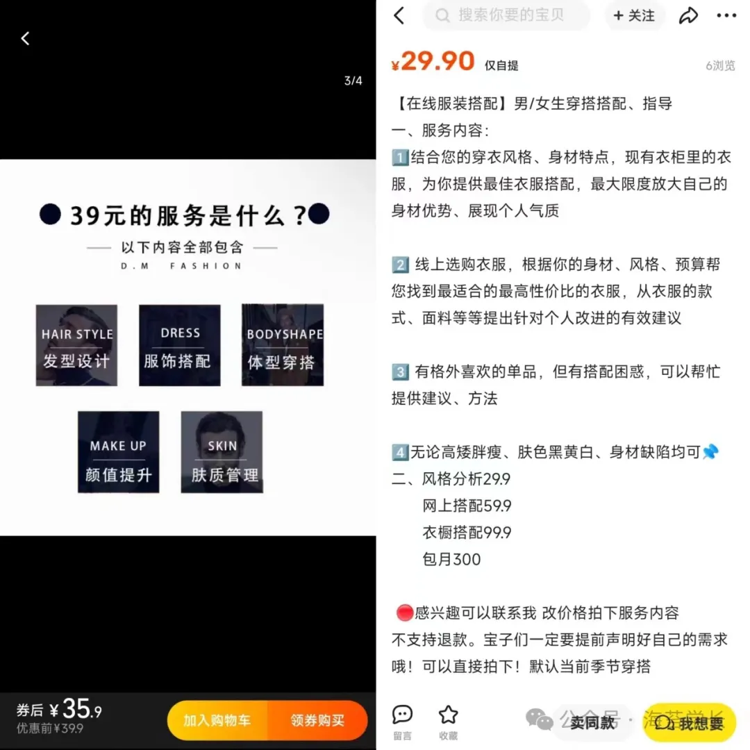 现在越来越多的人开始注重自己的形象和外表,所以有关穿搭、发型设计、形象管理等方面的教程需求也在逐渐增加。很多人现在都有“形象焦虑”,在街上看到别人穿的很好看,很有气质,总是很羡慕,为啥自己穿的总是感觉土土的。一杯奶茶钱就能让自己变“帅/美”很多人真的会尝试!客户付款后,发他一个PDF或者文档《变帅变美攻略》全在里面,或者让客户加微信,问一下客户基本信息、身高、体重、职业等,然后从之前就准备好的模板里面发几个案例给他(毕竟一般身高、体重差不多的人穿搭方案都趋同) 哪怕你平时不研究穿搭也不影响做这个项目,这些案例看多了,就像服装店的售货员一样,什么人,多高,多重,穿什么好看,你也能轻易给出方案。