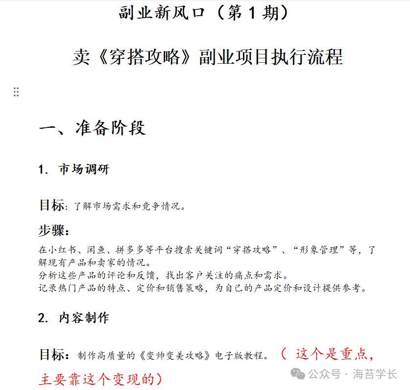 引流这些客户到微信,以后还能通过其他方式变现,比如微商卖服装等,只要有客户有流量,以后就不愁赚钱,一举两得 哈哈!个人觉得 这是一个容易上手且有潜力的副业项目:1. 需求存在:很多人对于提升个人形象和魅力有需求。2. 成本较低:电子版教程的生产成本相对较低,和那些动不动前期就要投入几千几万的项目比,这个几乎没什么成本啊,最差也就花你点时间。3. 易于传播:通过互联网平台,可以快速将产品推广到广泛的潜在客户群体,我觉得通过小红书写文字宣传挺好,里面的用户群体都是一些爱美的年轻人 也很符合(闲鱼和小红书是普通人赚钱最基本的门槛)4. 可扩展性:一旦内容制作完成,可以不断复制销售,边际成本较低,只要前期花一些时间把资料和攻略做好一点,后面一套相同的攻略可以卖很多人,相当于前期种了一棵树,以后天天就有果子收,多香啊!普通人赚钱的Sop:2个微信+10个小红书账户+10个闲鱼账户=月入过万(等业务真的月入过万了可以考虑花5千请一个全职助理)总的来说,这个项目作为一个副业是可行的 目前做的人还不多,属于一个小众蓝海赛道,但前期需要你投入一定的时间和精力来制作高质量的教程(网上可以找到很多资料,整理一下就好,如果能力强一点的再做出自己的风格就更好了),后面就是推广和营销。准备工作弄好,后面就不用花太多时间了,等客户下单,弄好点一个月卖个几百单,赚个几千生活费美滋滋,而且随着你做的时间越长,粉丝越多 后面赚钱也会越来越多的,同时你引流到私域的客户将来也会是一笔宝贵的财富!