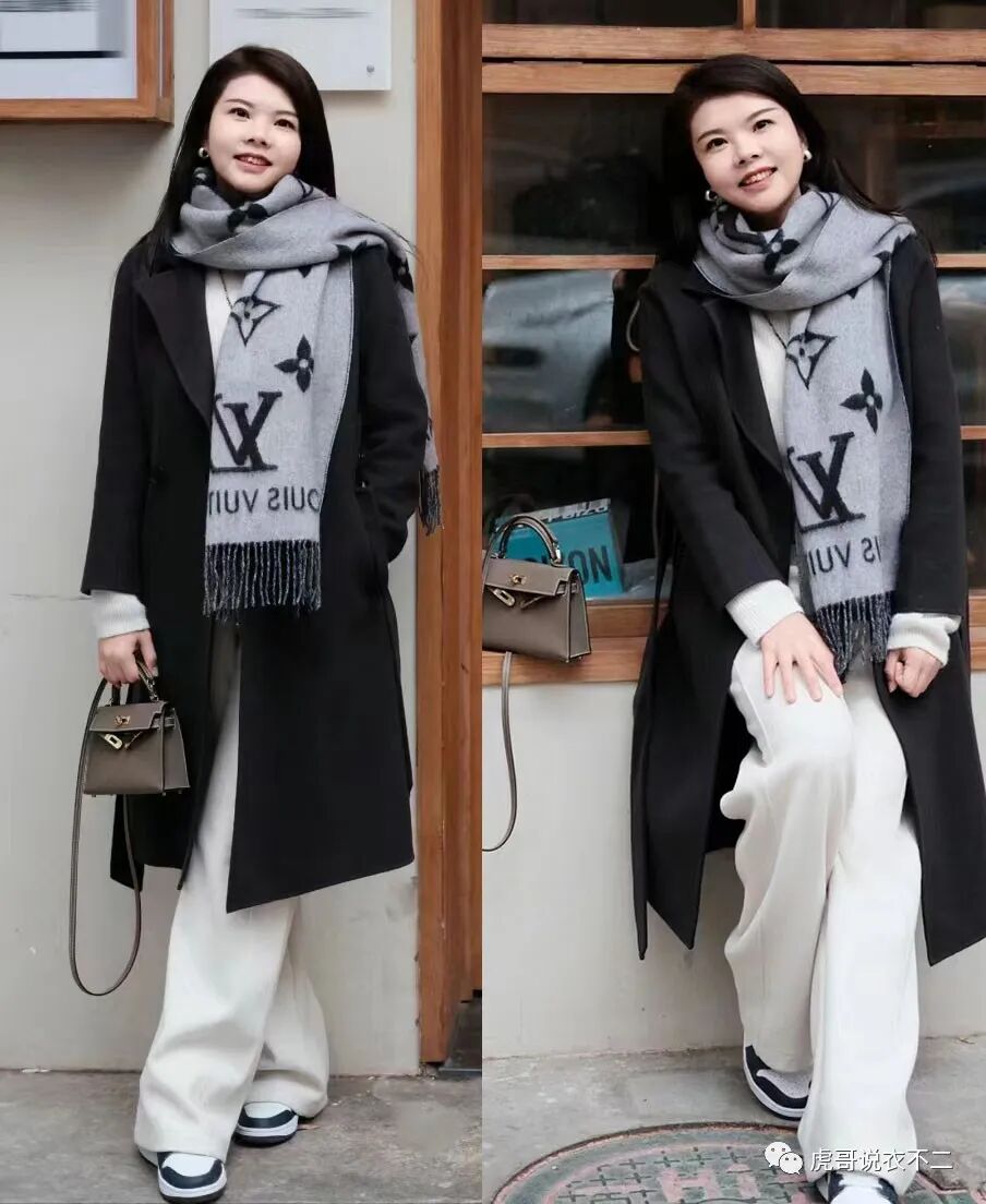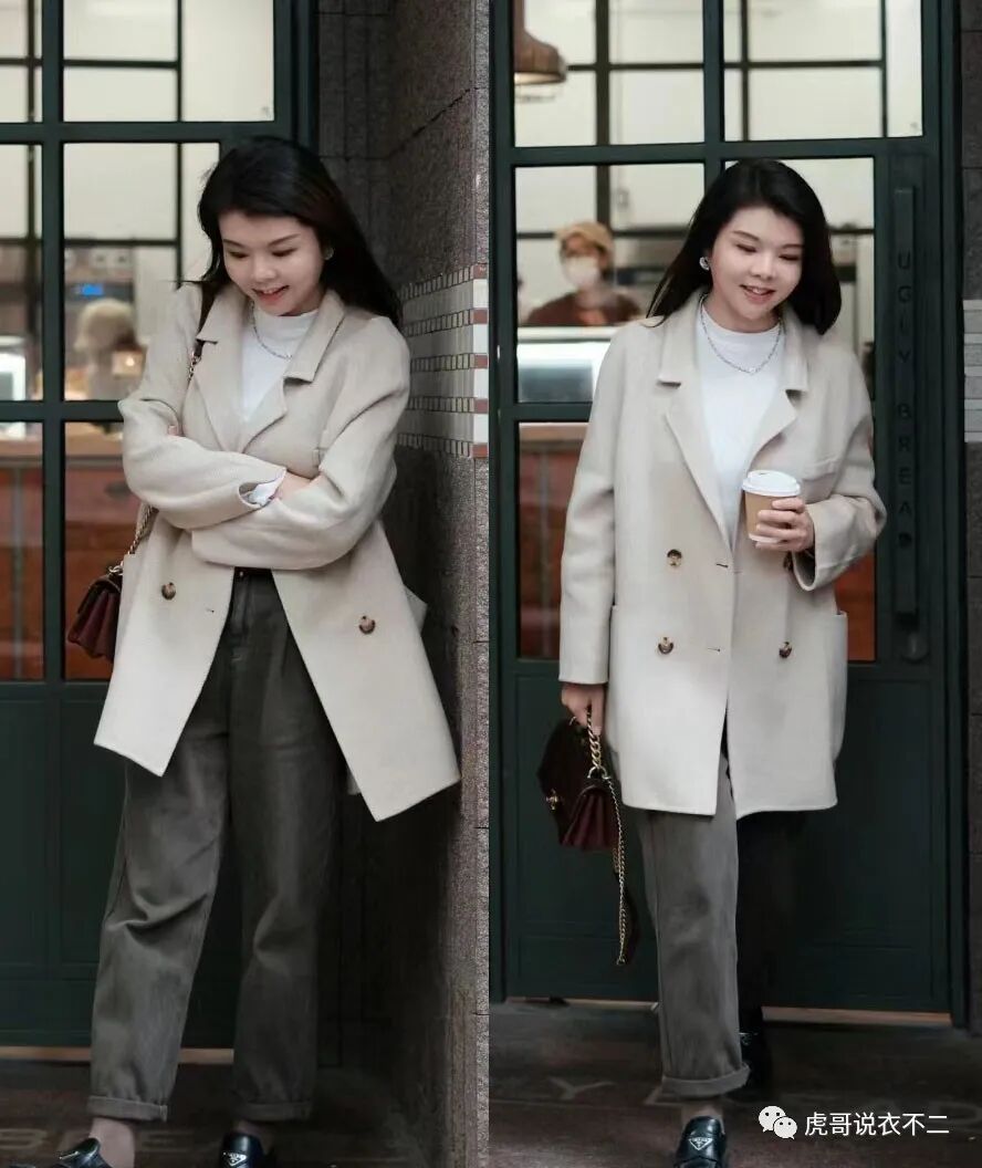 上图这位女士的穿搭中,穿着的外套就是白色的配色,干净又清亮的色调,可以不费力的起到显白抬气色的效果。