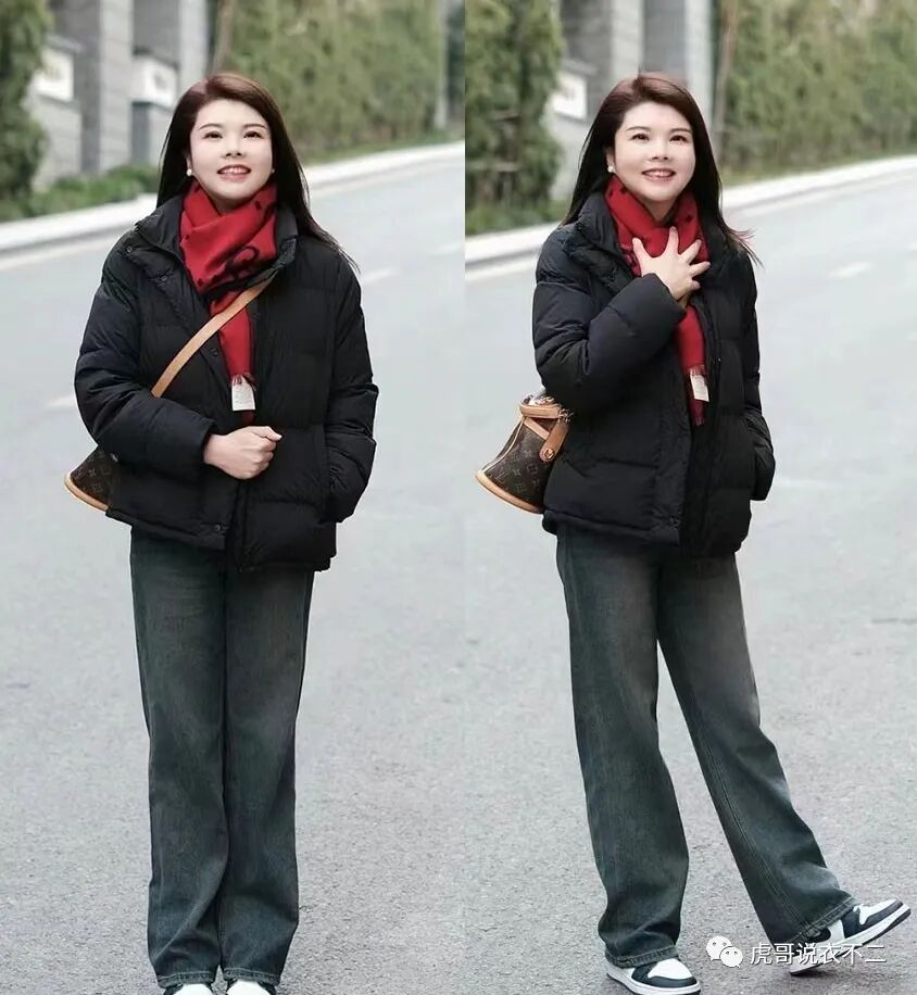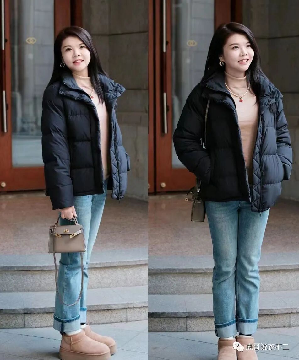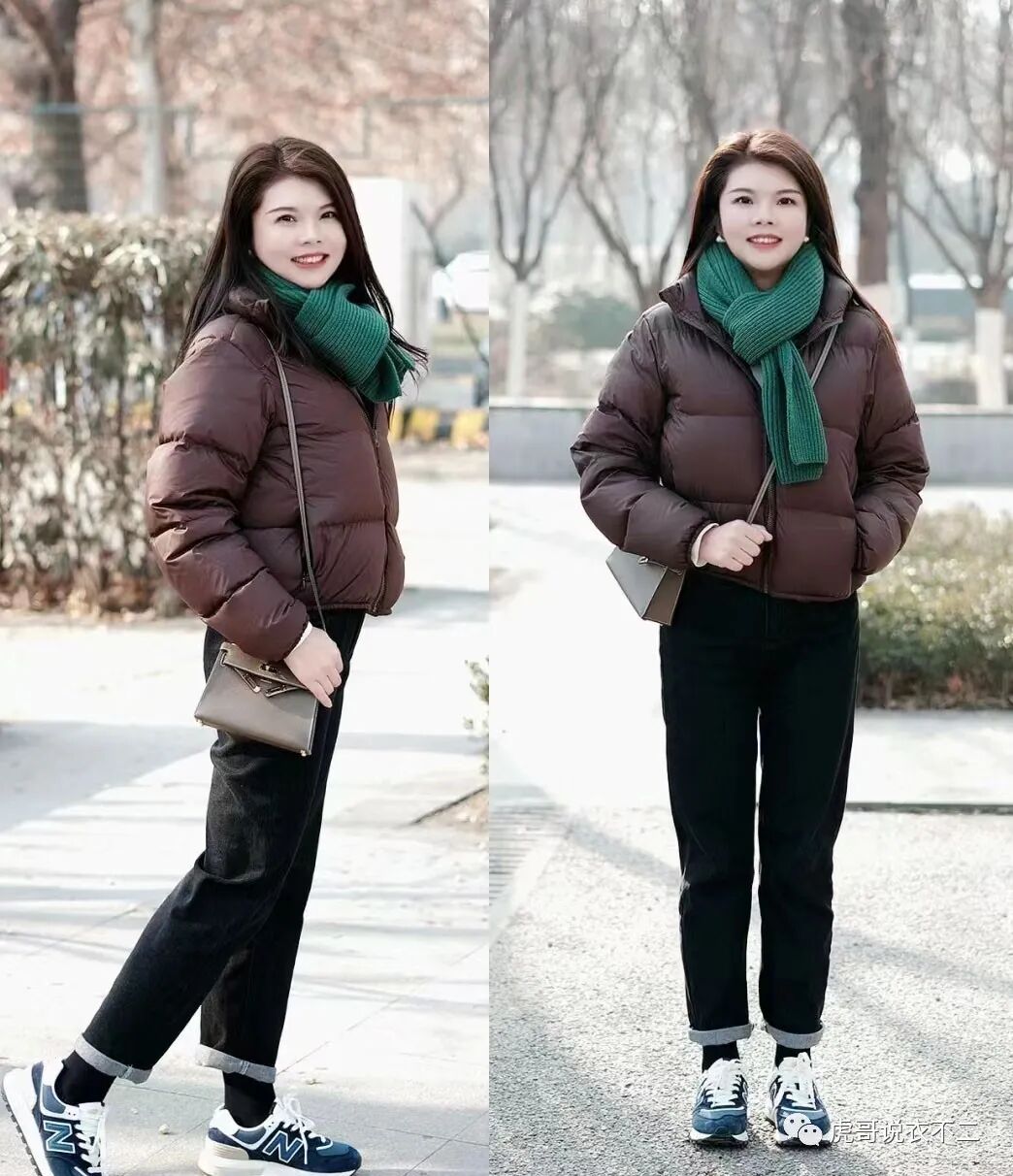 像图中这身穿搭中,就运用了“短羽绒服+直筒裤”的穿法,其中版型短与长、宽与窄的对比,都将整体效果协调出了更自然的感觉,整个人看起来时尚又有型。