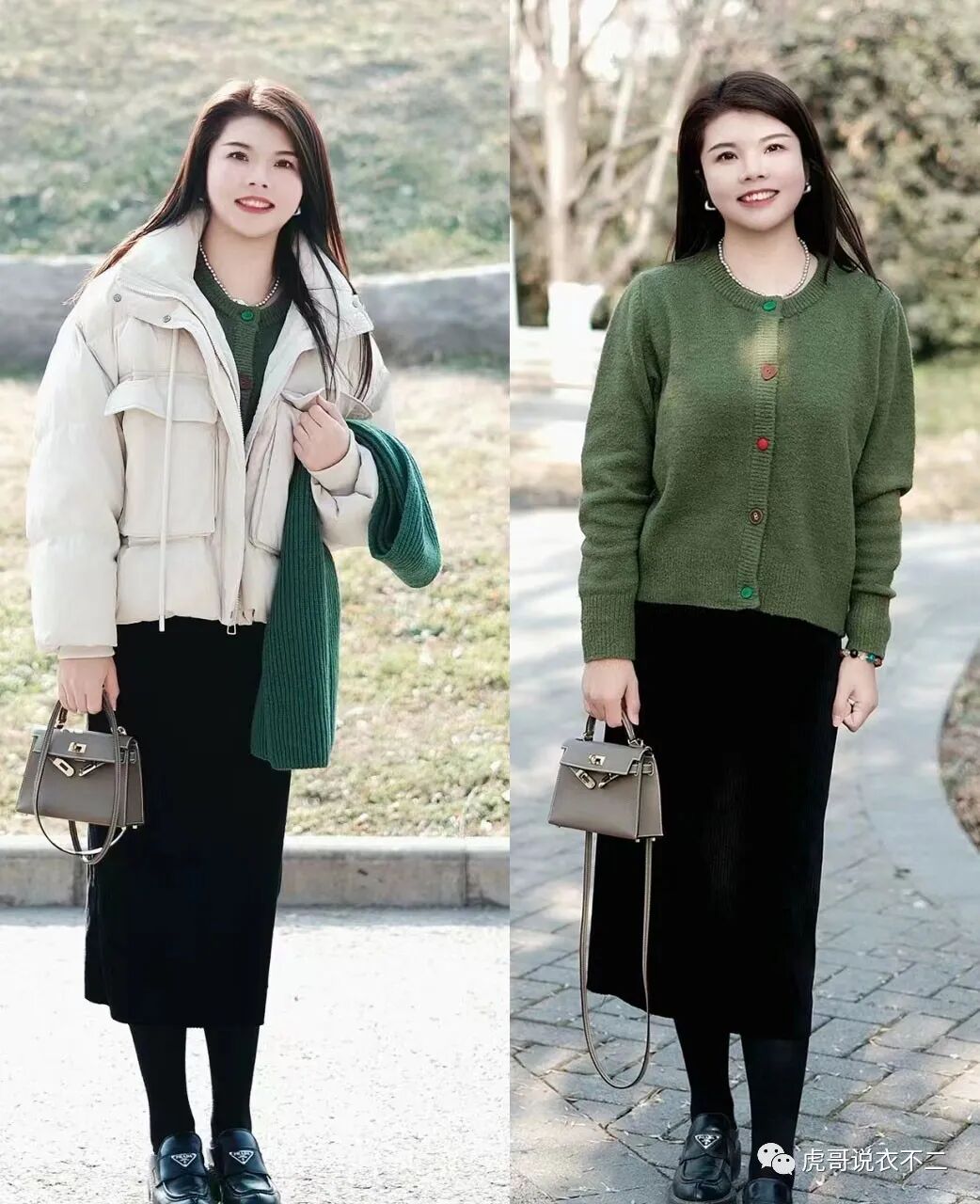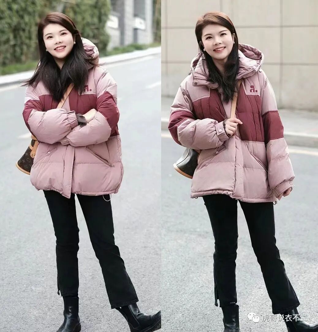 比方说在冬季很令人头疼的羽绒服,就由于面料版型比较宽的问题,有向外扩展身形的作用,这时直接运用短款,能够通过对腰线的营造,适当的解决这一问题。