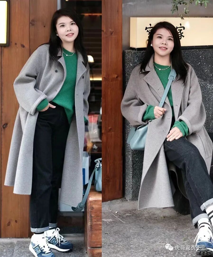 例如上图这身“长大衣+深色牛仔裤”的搭配中,两者就结合出了十分大气舒展的风范,而与绿色毛衣的配合,显然因为采用了扎衣角的方式,灵活的划分出了修长比例。