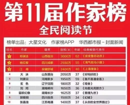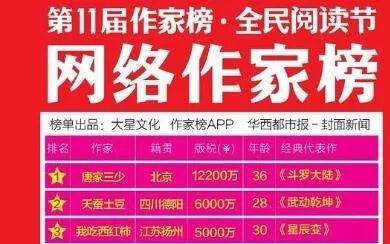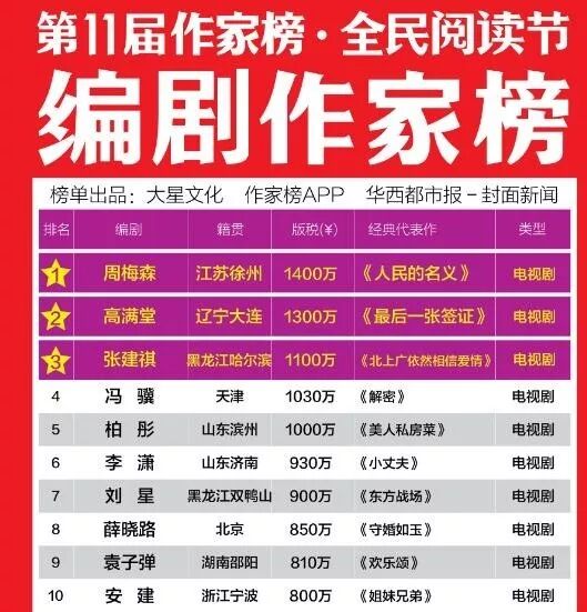 根据2017年第11届编剧作家收入排行榜来看,周梅森的《人民的名义》以1400万排在第一位,在2017年第11届作家榜年度网络作家富豪榜中,唐家三少版税收入12200万拍第一,柳下挥版税收入2500万第九,高楼大厦以2100万排第十。2017第11届作家榜年度传统作家富豪榜,郑渊洁以版税3000万排第一,杨红樱以版税2550万居于第二。