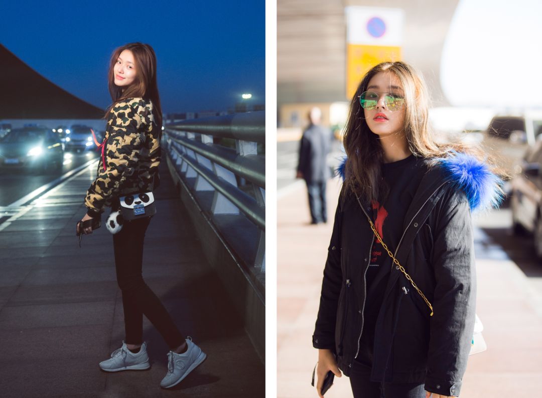 右边的私服元素太多了,迷彩本就很难驾驭,再配上熊猫样式的包包还不够,强行加了配饰,整体很累赘,一眼看不透。