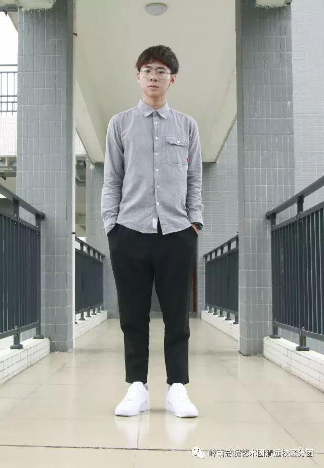 经典的灰衬衫+黑色休闲裤