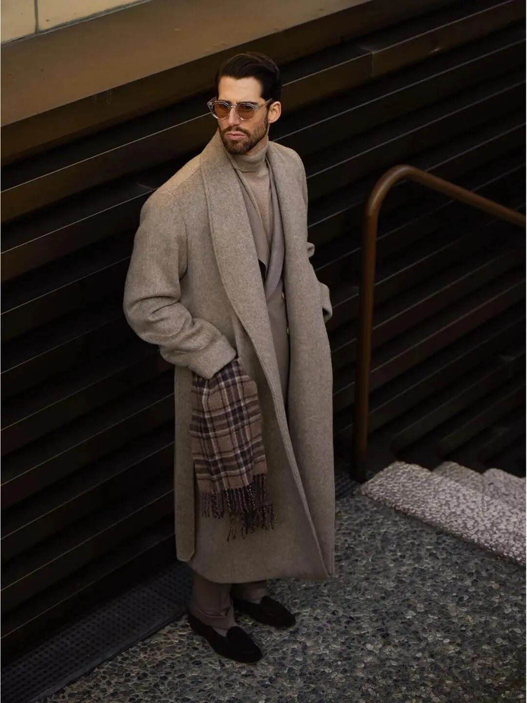 既然放弃了“衣不塞裤腰”的穿法,那就得考虑内搭与外套之间的色彩搭配了,如图中的同色系穿搭,外套以米灰色色系为主,内搭也选择了同一个颜色。