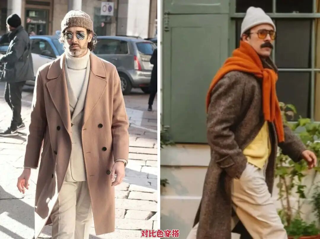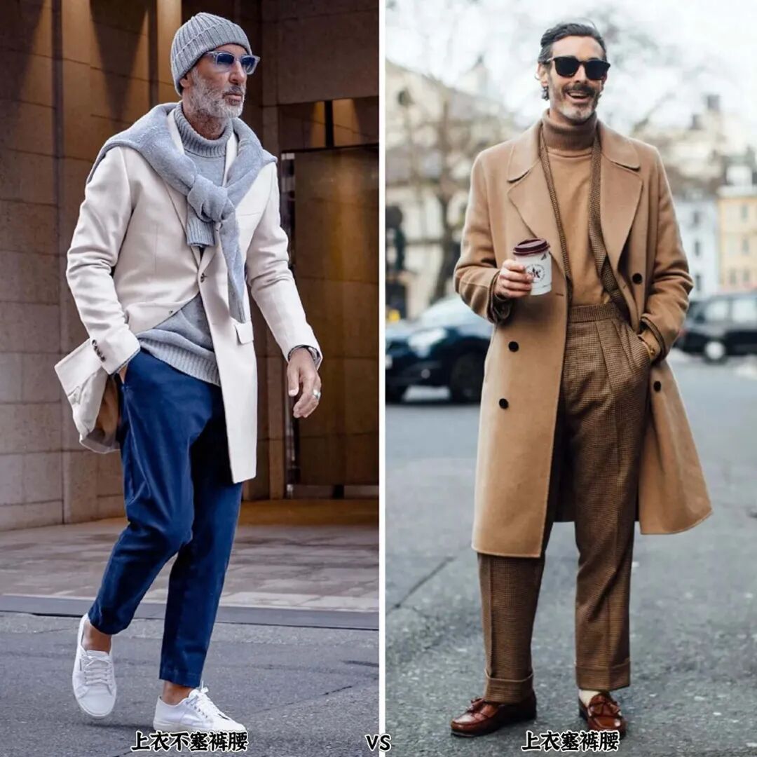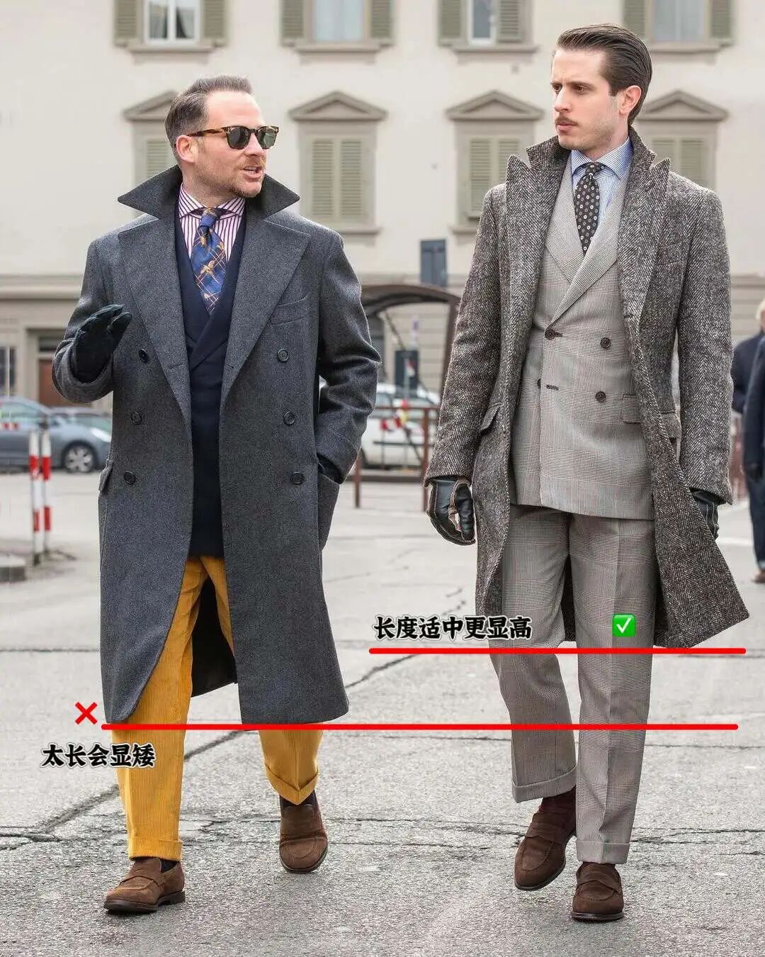 比如,下面这两个人的穿搭,都是选择大衣外套,但从视觉上看过去,左边的穿搭相比于旁边的穿搭是有点显矮的,其实通过对比两人的大衣长度就可以发现,一个在膝盖以下,一个在膝盖以上。