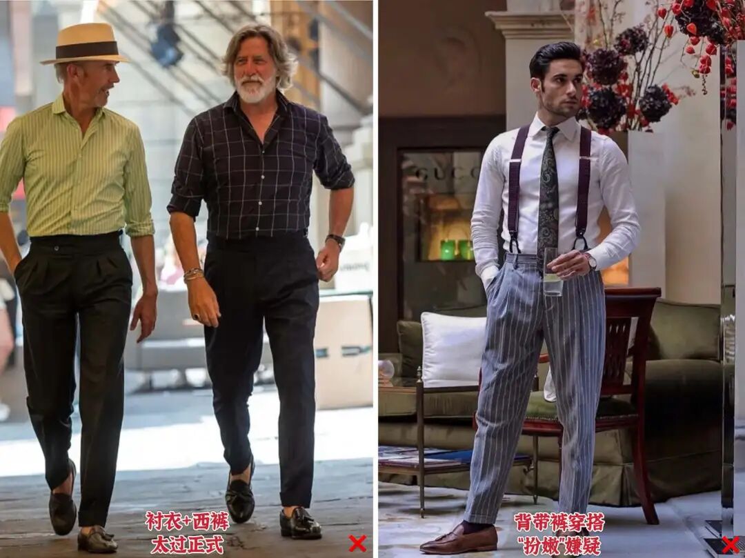 比如,右边这张图用背带裤搭衬衣,衬衣的衣摆都塞进裤腰里了,恰恰就是这样无心之举的穿搭,就会给人的第一视角在“扮嫩”,也与之中老年男人穿搭需求背道而驰了。