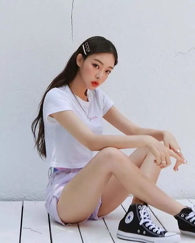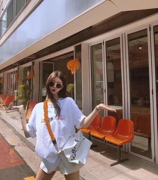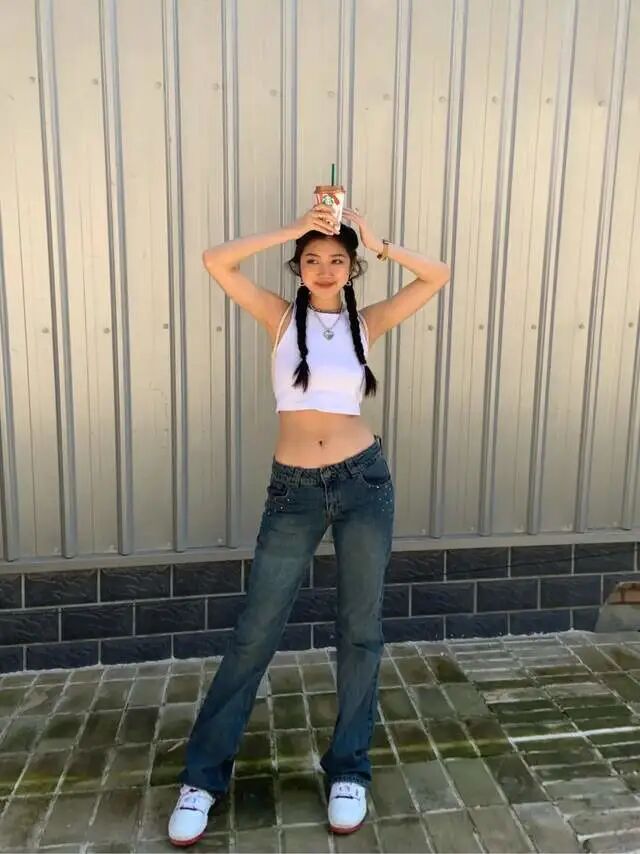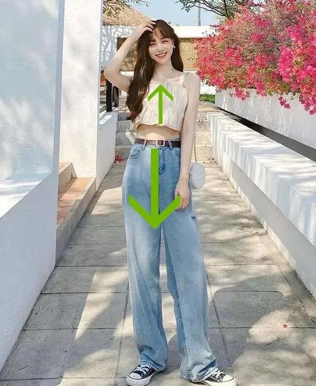 这是非常经典的上短下长的穿法,主要是为了让下半身的比例看上去更好,有修长和高挑的效果。将上衣的长度尽量缩短,选择短款的上衣、塞衣角或者用腰带制造腰部的分割线,都是ok的。