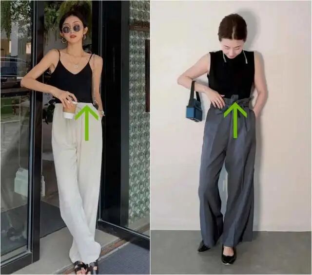 前面提到胯宽腿粗的身材就要尽量把裤子腰部的线条抬高,才能打造视觉上的显高法,把圆润宽大的臀胯隐藏起来,所以无论穿什么类型的裤子,都要尽量选择裆线和腰线同时往上提的设计,最好靠近肚脐,或者超过肚脐的腰线都不怕。