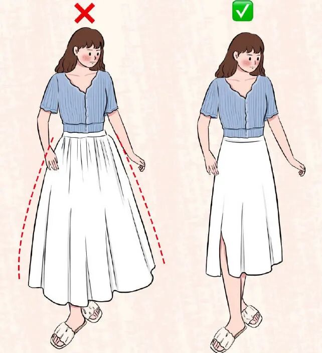 对于容易膨胀的半身裙,适当缩窄横向宽度的重心下移影响,都会利于显高显瘦。如果再有开叉等不规则设计,效果更佳。下图的对比即是证明。