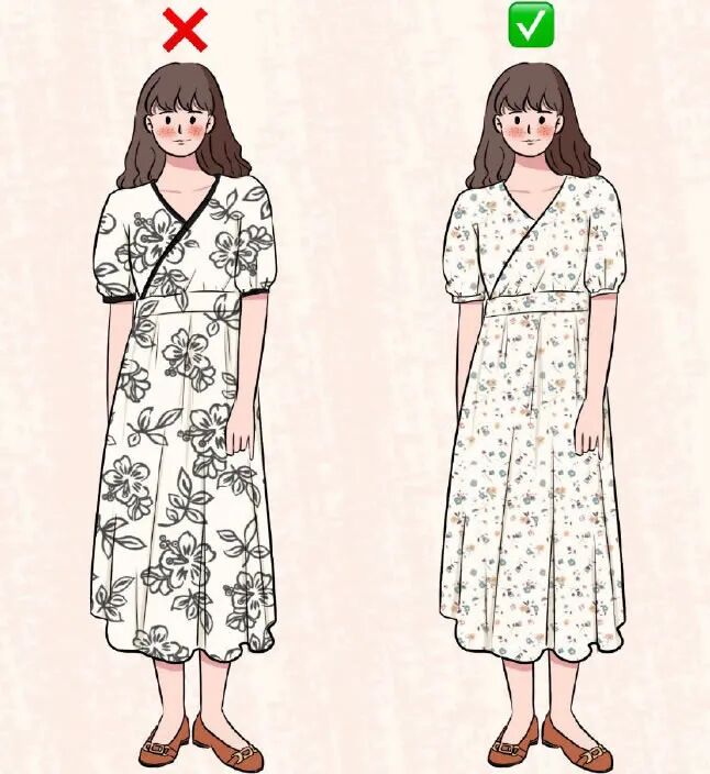 小量感的印花非常适合娇小可人的小个子,可爱甜美还具有小清新特点,无论是从身型还是气质,都是契合的。相反,大量感稀疏的印花,过于写实夸张,以压倒性的气势让小个子的存在感更微弱。