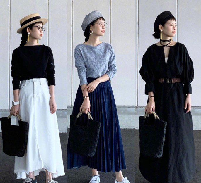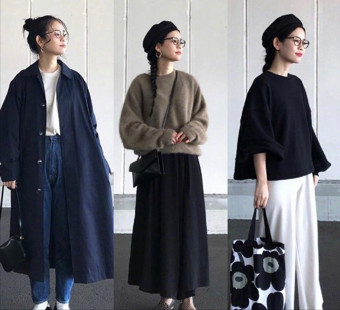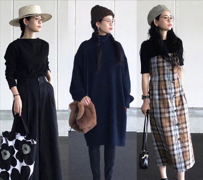 下图是日本小个子博主的穿搭,通过调节高腰线,全身同色系,再控制材质的质感,同时做到将焦点上移到头面部,适当放摆的裙子也可以显高。