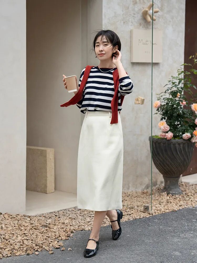 条纹T恤配纯色半身长裙,清爽减龄▼文字原创,图片来自网络,如有侵权请联系我们删除,谢谢。