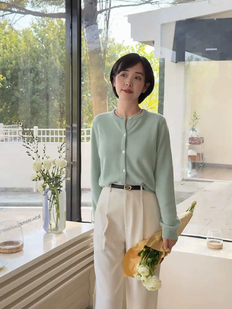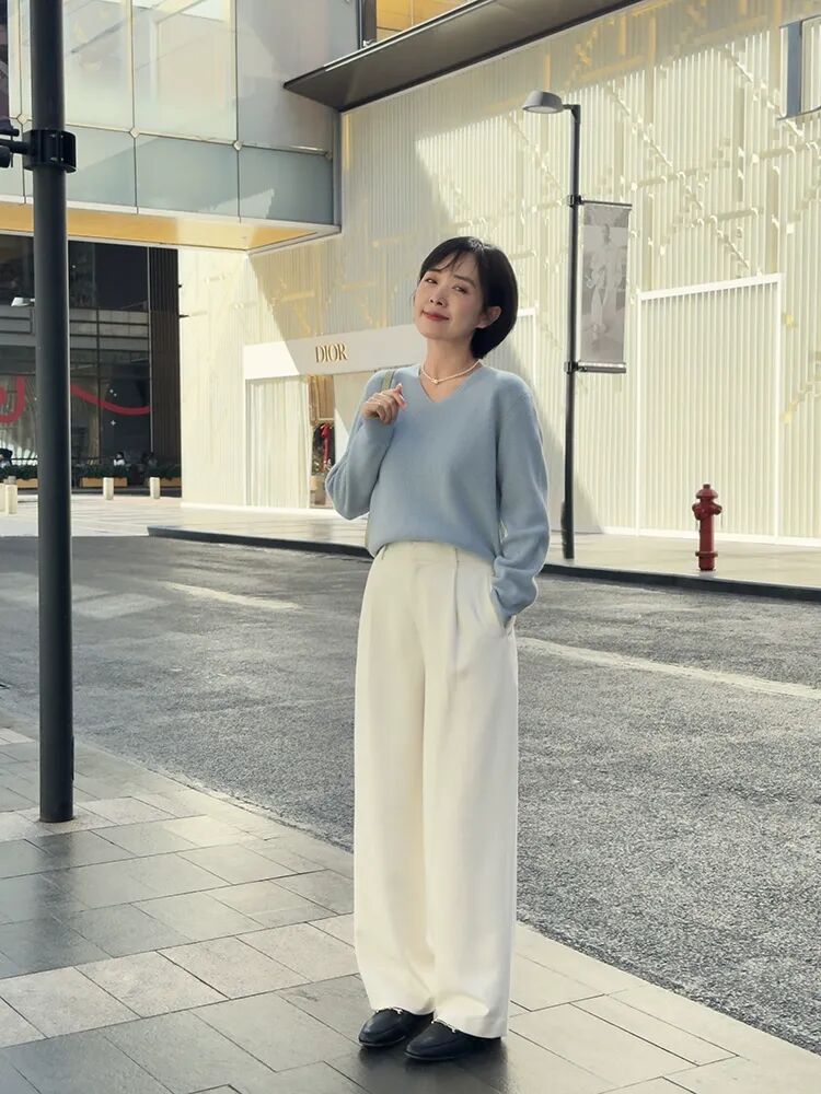 利落的短发+薄荷绿针织开衫+白色直筒裤,温婉知性的成熟女性的模样▼作为成熟女人总是想穿一点“记忆点”在身上,却又担心选择不慎弄巧成拙,不妨学学沫里穿经典元素;