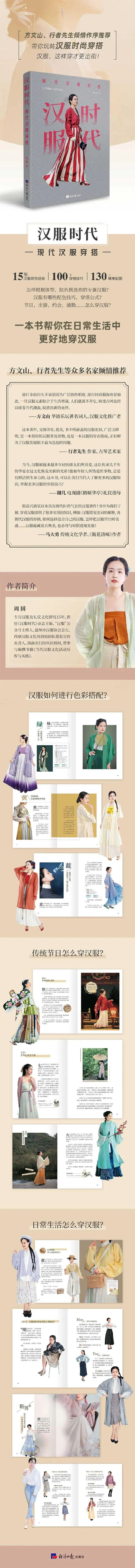 周圆编著的《汉服时代:现代汉服穿搭》是一部面向大众的实用汉服穿搭指南,展示了100余种汉服的生活化穿搭技巧,涵盖汉服传统色搭配方案,及适用于节日节气与日常生活不同场景的穿搭公式。