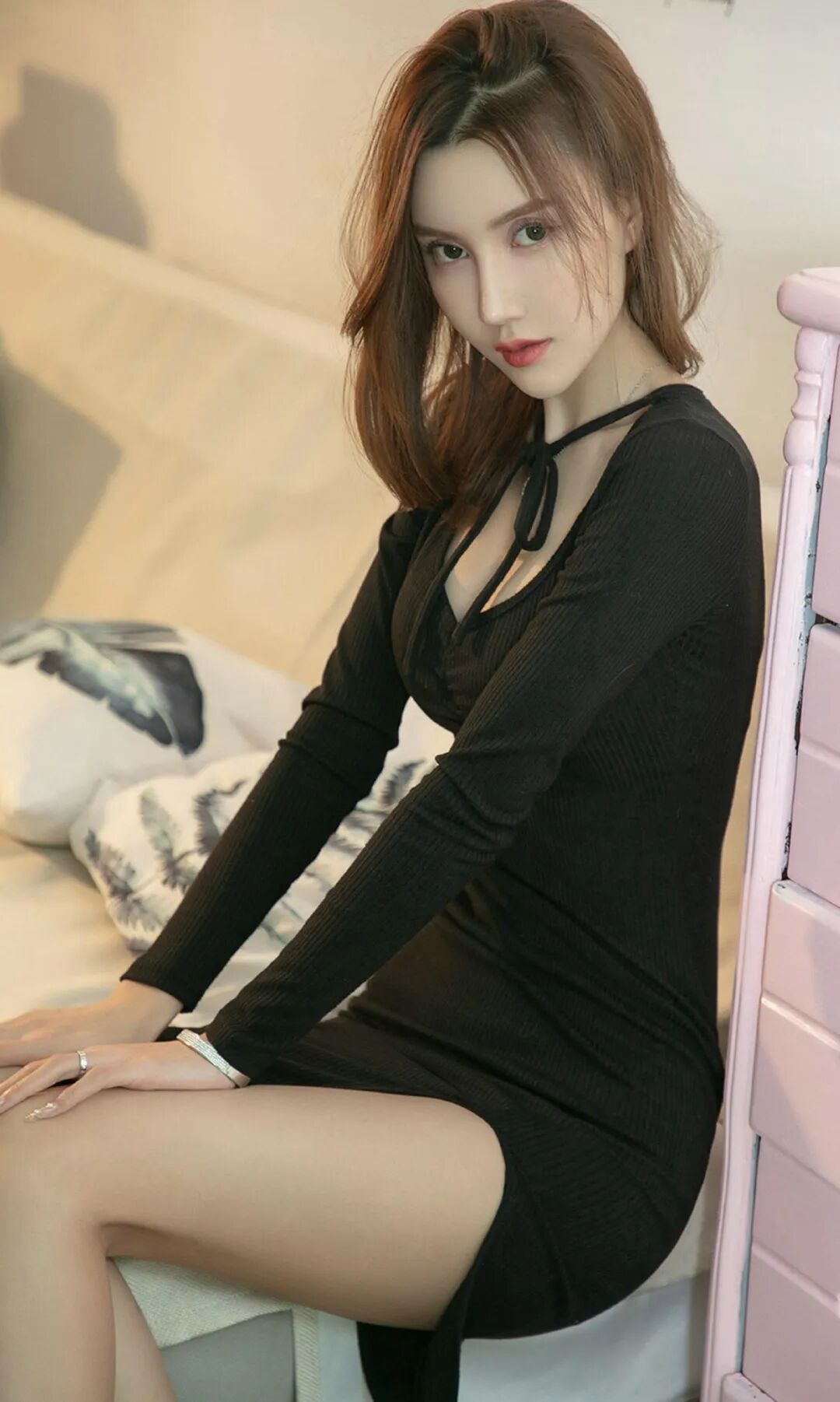 - 背景是一个室内环境,米色的窗帘、毛毯和抱枕等元素营造出温馨舒适的氛围,与黑色的穿搭形成了色彩上的对比,使人物更加突出。背景中的艺术画作增添了一丝文艺气息,与整体穿搭的时尚感相得益彰,展现出一种优雅且有品位的生活方式。