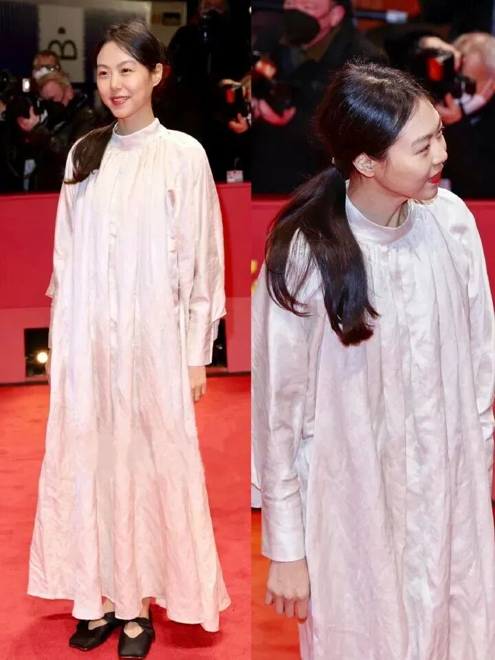 2022年,金敏喜现身柏林国际电影节,她身着小众品牌Toogood的白色连衣裙,剪裁简约轮廓优美,铜氨丝与亚麻混纺的面料在闪光灯下不动声色地撒发柔和又细碎凌厉的光。如同月光下微微浮动的海面,颇具洗尽铅华之感,令人想起波提切利画笔下《维纳斯的诞生》中的维纳斯,清新柔美,如一阵清风迎面吹来。