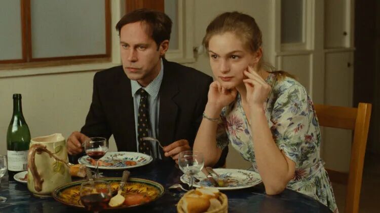 甚至多人物的着装和环境共同完成了配色的互补:男主的女友伊芙更是在首次见面时,身着一件和用餐瓷盘有着相似花色的连衣裙。